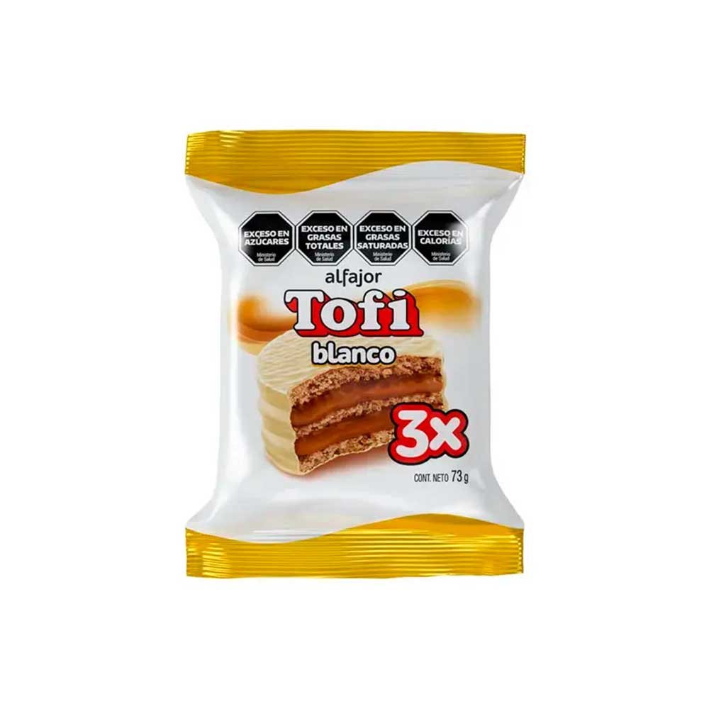 Alfajor triple relleno de dulce de leche cubierto con baño de chocolate blanco. Pack 6 unidades x 438g.